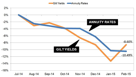 | Fig 1: Chart comparing annuity rates and 15-year gilt yields |